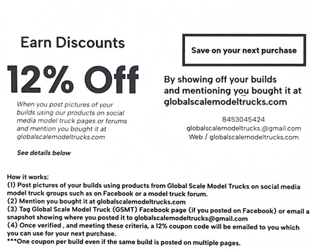 Build Model Trucks Using Our Products, Show Them in Model Truck Groups, Mention Us and Earn 12% Discounts Off Future Orders.