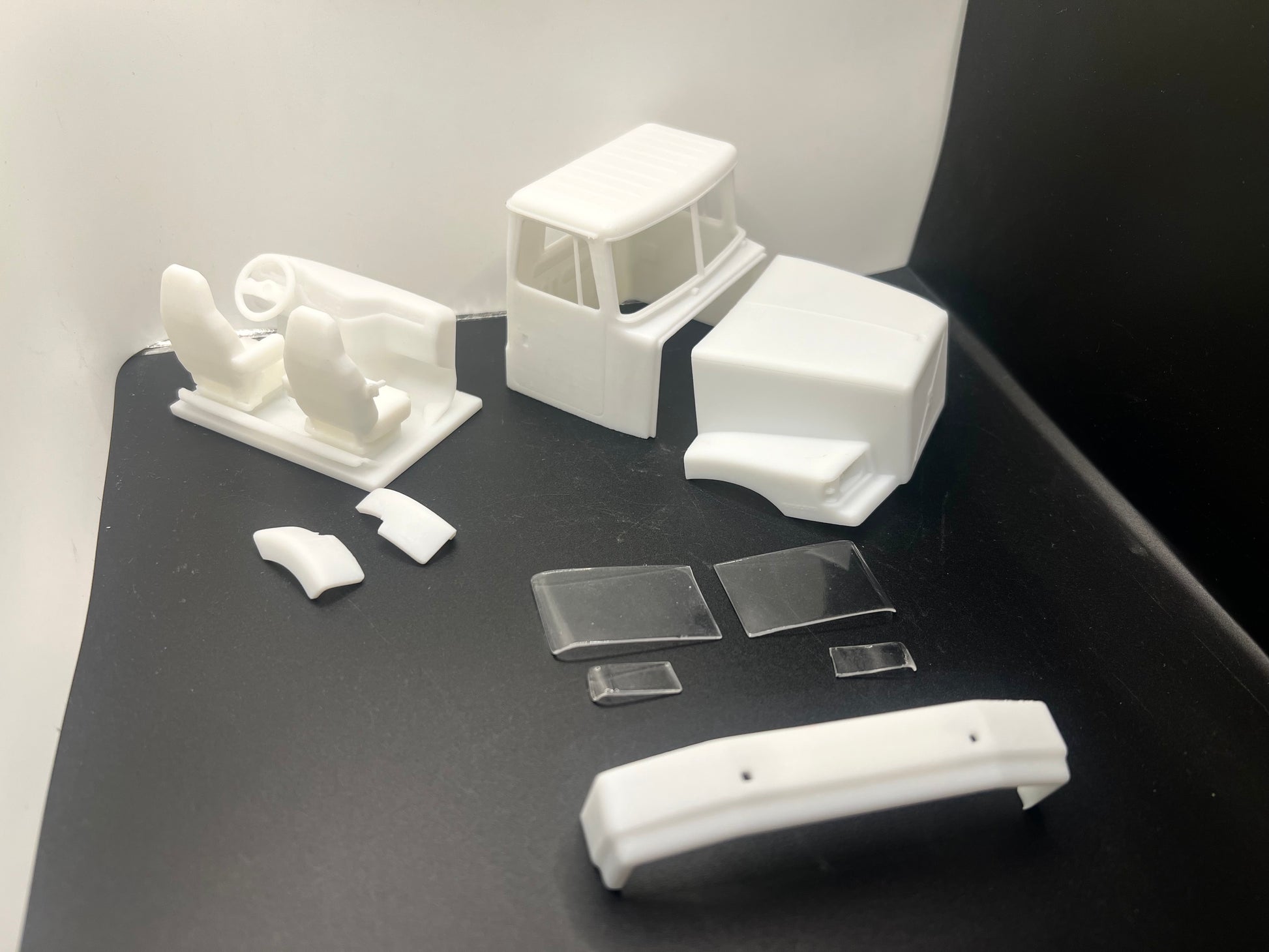 Cab, hood, interior ( generic), windshield, bumper, headlights.