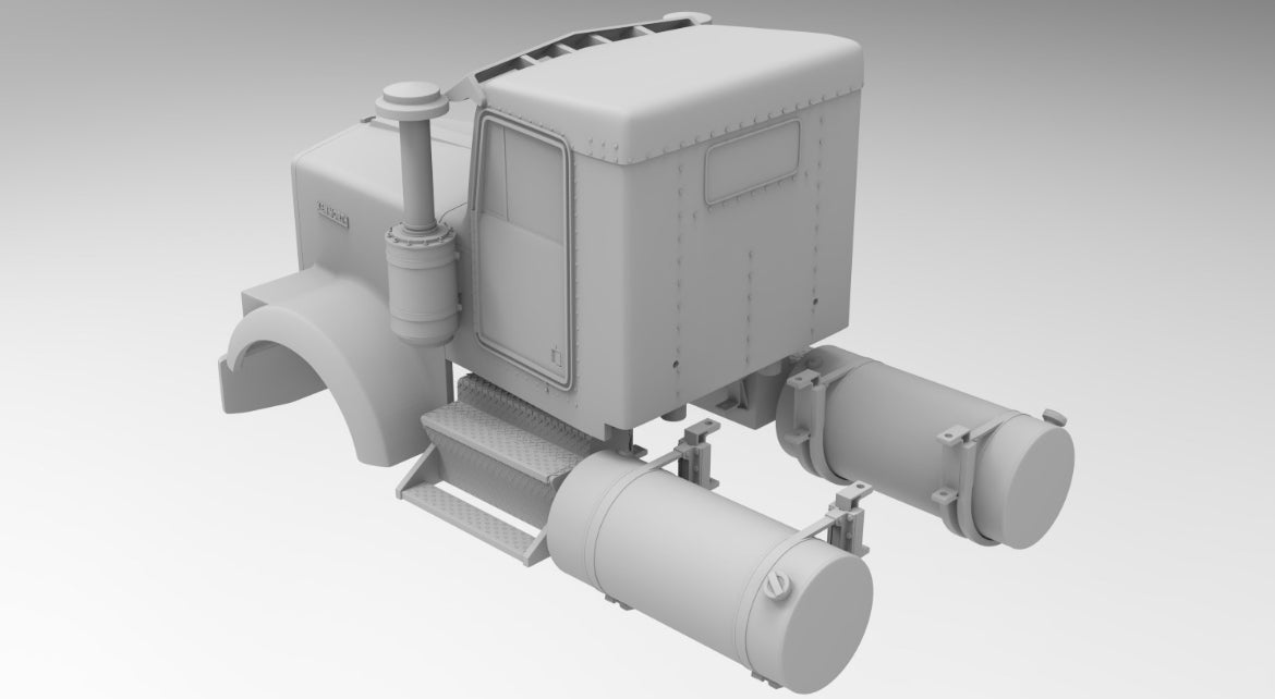 Day cab, hood, bumper, interior, steps, standard air cleaners, clear resin windshield, sun visor. ** Intial design rendering shown. Printed parts pics will be added soon. does not include fuel tanks or high intake pipes